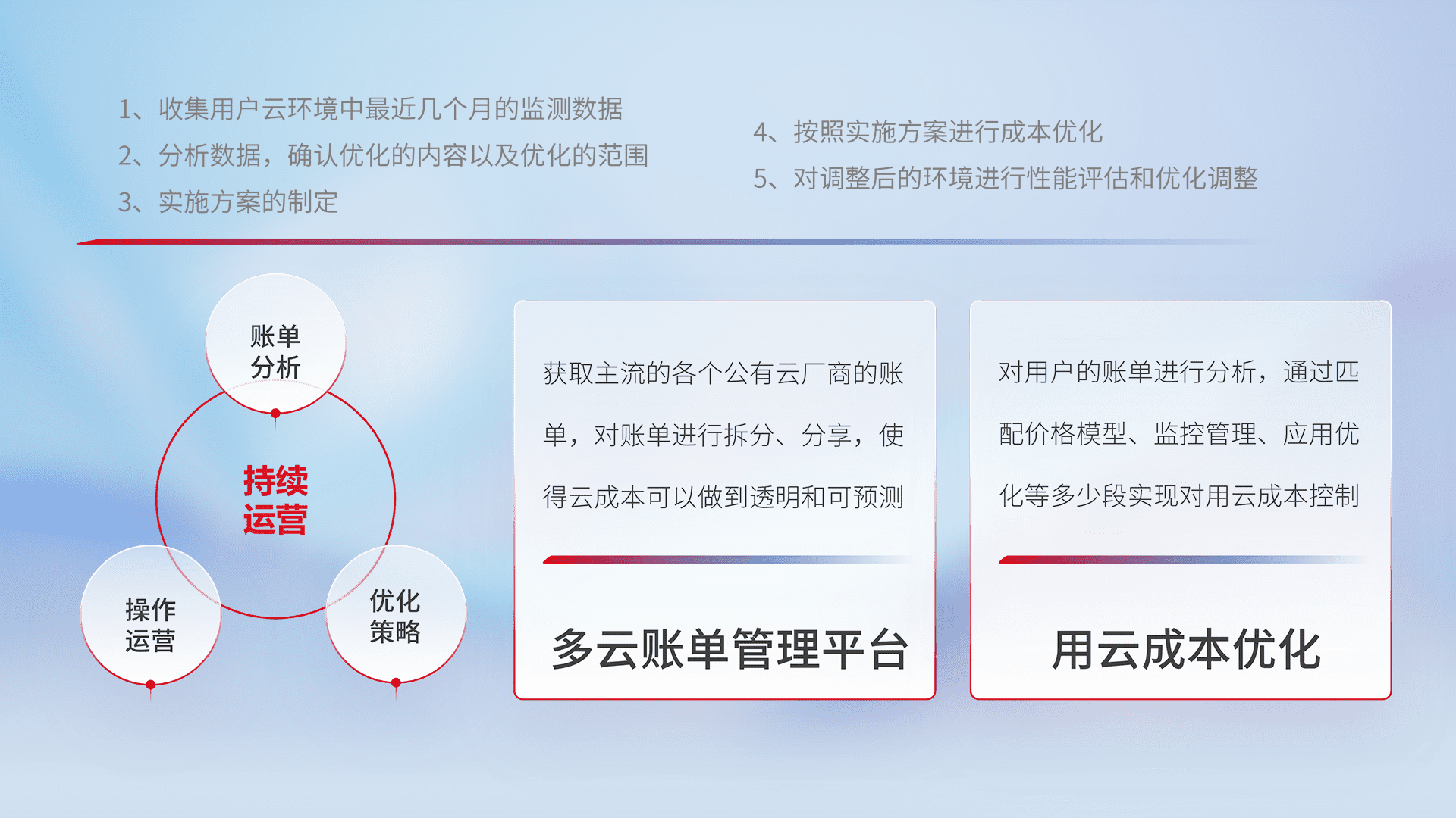 通过多云纳管,,以统一的资源数据模型把客户的云资源进行抽象和封装,,,进而实现对多云资源的统一操作,,,保障云资源管理的可靠性、、、、稳定性与可用性。。。量身定制化运维内容,,,配置、、、、开发运维、、、补丁管理、、备份、、、监控、、、认证和访问管理、、审计和日常巡检等,,,保障在用云过程中的可靠度,,,稳定度以及高可用率。。。。